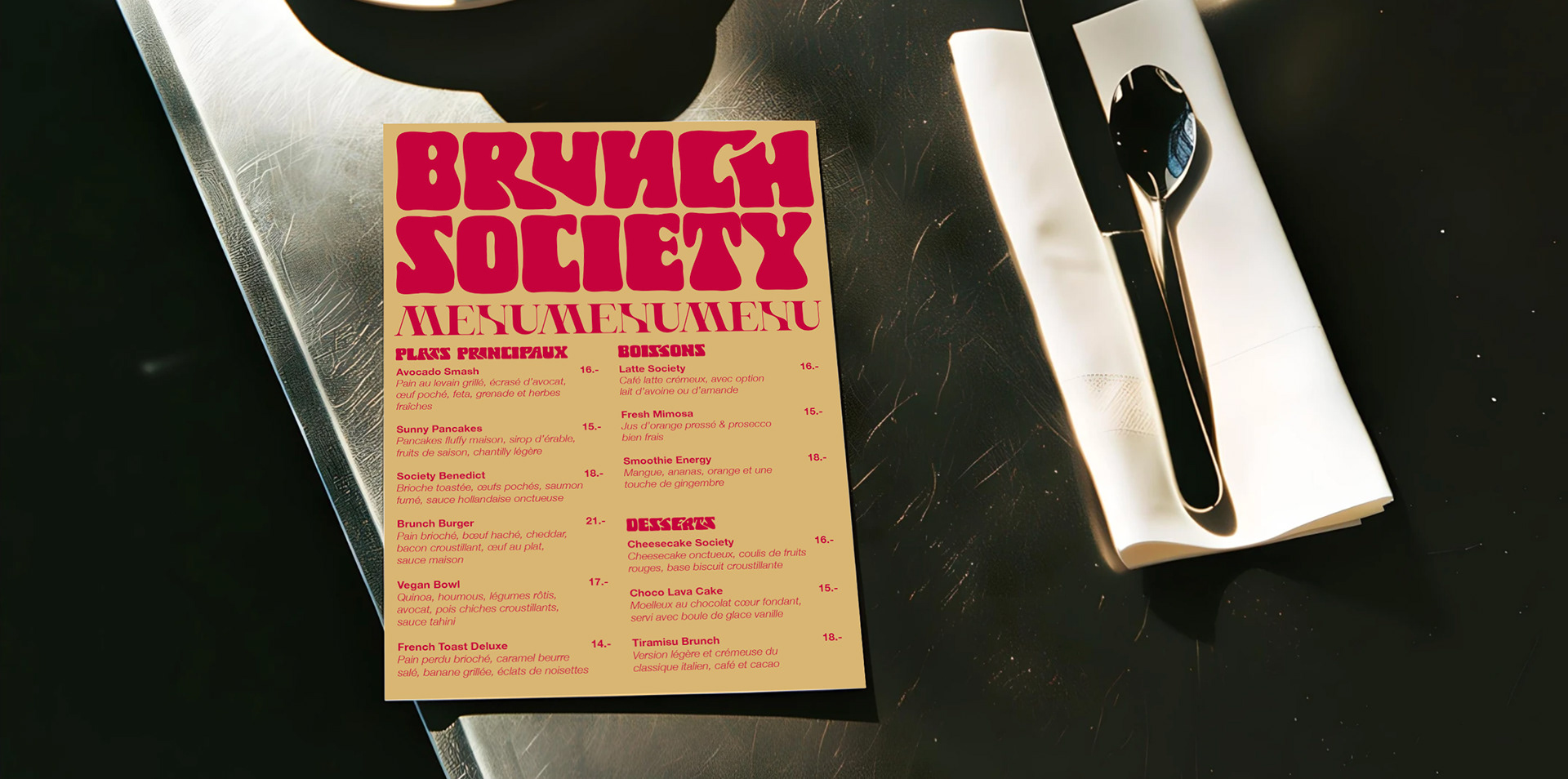 Le projet Brunch Society illustre la création d’un univers complet, du logo aux supports imprimés en passant par les déclinaisons textiles et accessoires. L’objectif étant de traduire l’énergie conviviale du brunch en une identité visuelle forte, moderne et accessible.
